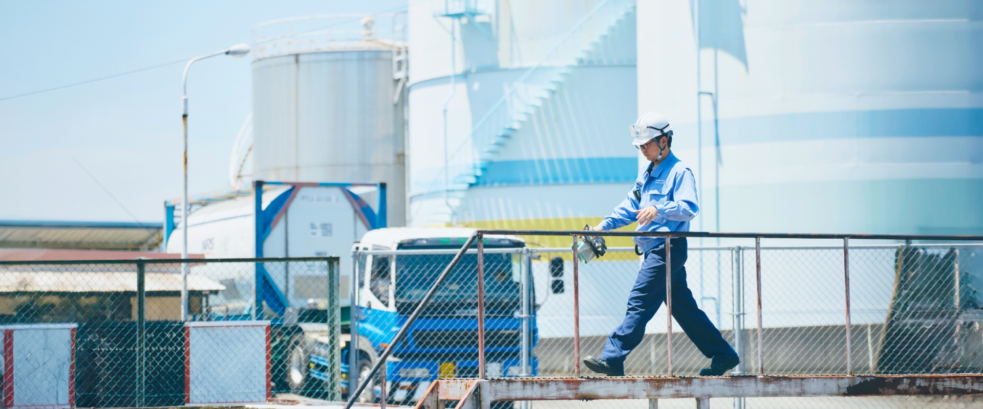 油槽所には大型貯蔵タンクのほか、タンクローリーによる出荷のための積み場など、さまざまな設備がありますので、それらが安全に使えるようにメンテナンスを計画的に行なっています。